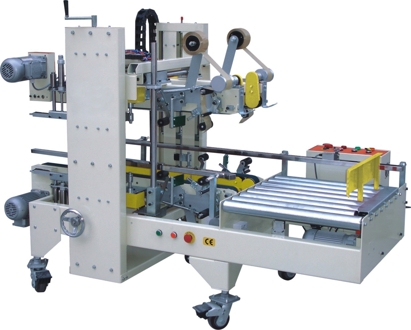封箱機(jī)機(jī)設(shè)計(jì)以操作簡(jiǎn)單、經(jīng)濟(jì)耐用、安全、故障率低為主,根據(jù)紙箱規(guī)格手工調(diào)節(jié)機(jī)器寬度及高度,適合同一時(shí)段同種規(guī)格紙箱封箱,紙箱經(jīng)前段封箱機(jī)中間上下封口后,進(jìn)入90度轉(zhuǎn)角機(jī)構(gòu),光電檢測(cè)到后機(jī)器根據(jù)紙箱規(guī)格自動(dòng)調(diào)節(jié)機(jī)器寬度及高度。